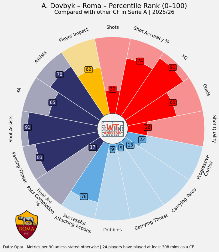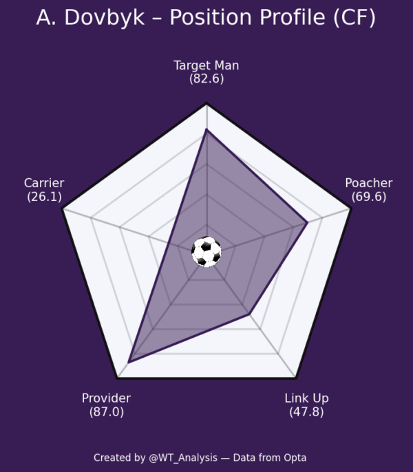 Dovybk has scored 3 this season in less than 500 minutes, this following on from scoring 12 for Roma last season, and 24 for Girona the season before that. What’s probably really appealing to Dyche is that he wins a ridiculous percentage of his attacking aerial duels, over 80%!