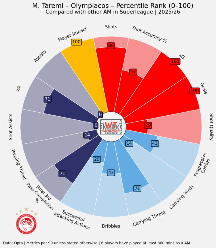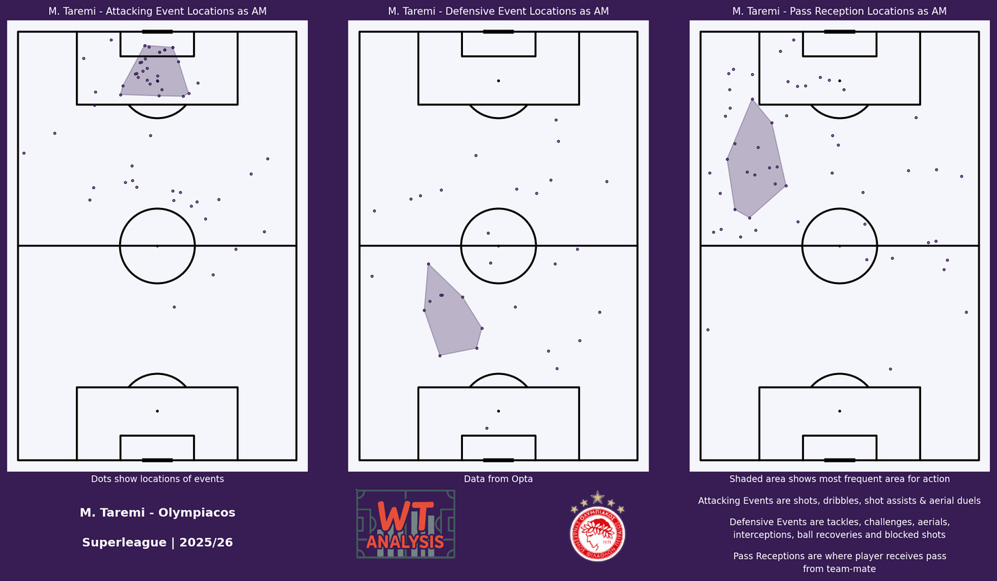 Iranian forward Mehdi Taremi is resurrecting his career in Greece after a bad season at Inter. Interestingly, despite being widely known as a striker he’s spent the majority of his time this season playing behind the striker, rather than being up front on his own.