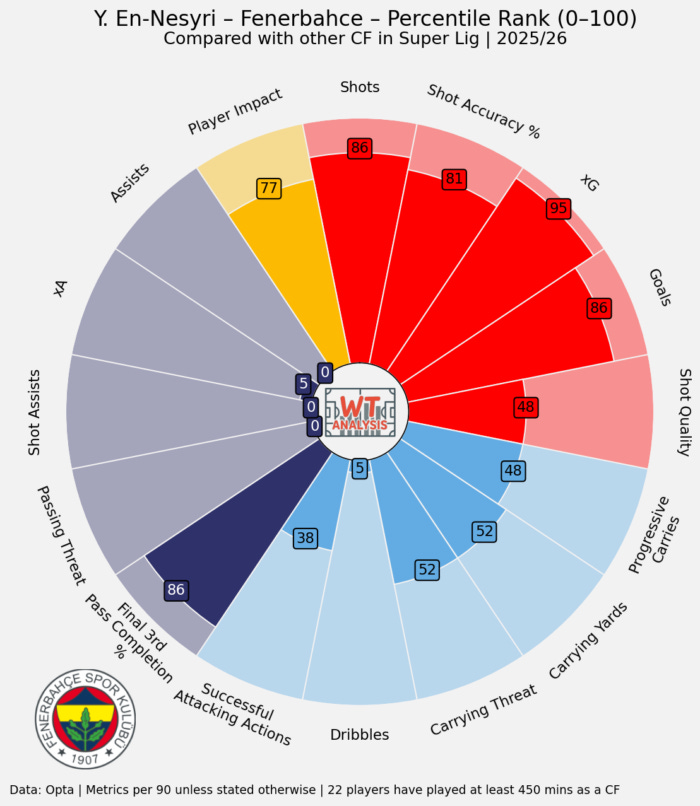 Moroccan striker Youssef En-Nesryi perhaps surprisingly left Spain to join Fenerbahçe 18 months ago, following a great season where he scored 16 in a poorly-performing Seville side. He scored 20 (and assisted 4) in his debut season in Turkey, and has scored another 7 this season - with none of them from the penalty spot.