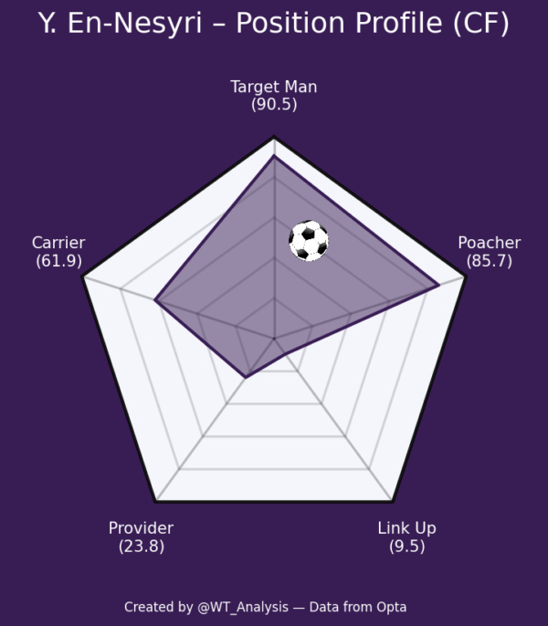 He’s scored at or above his expected numbers throughout his career - and this season he’s won just under half of his attacking aerial duels. His shot locations are closer to goal than Igor Jesus, who we know isn’t the ‘poacher’ that Forest (and many others) are missing. En-Nesyri profiles as a Target Man who can finish, but is unlikely to bring others into play.