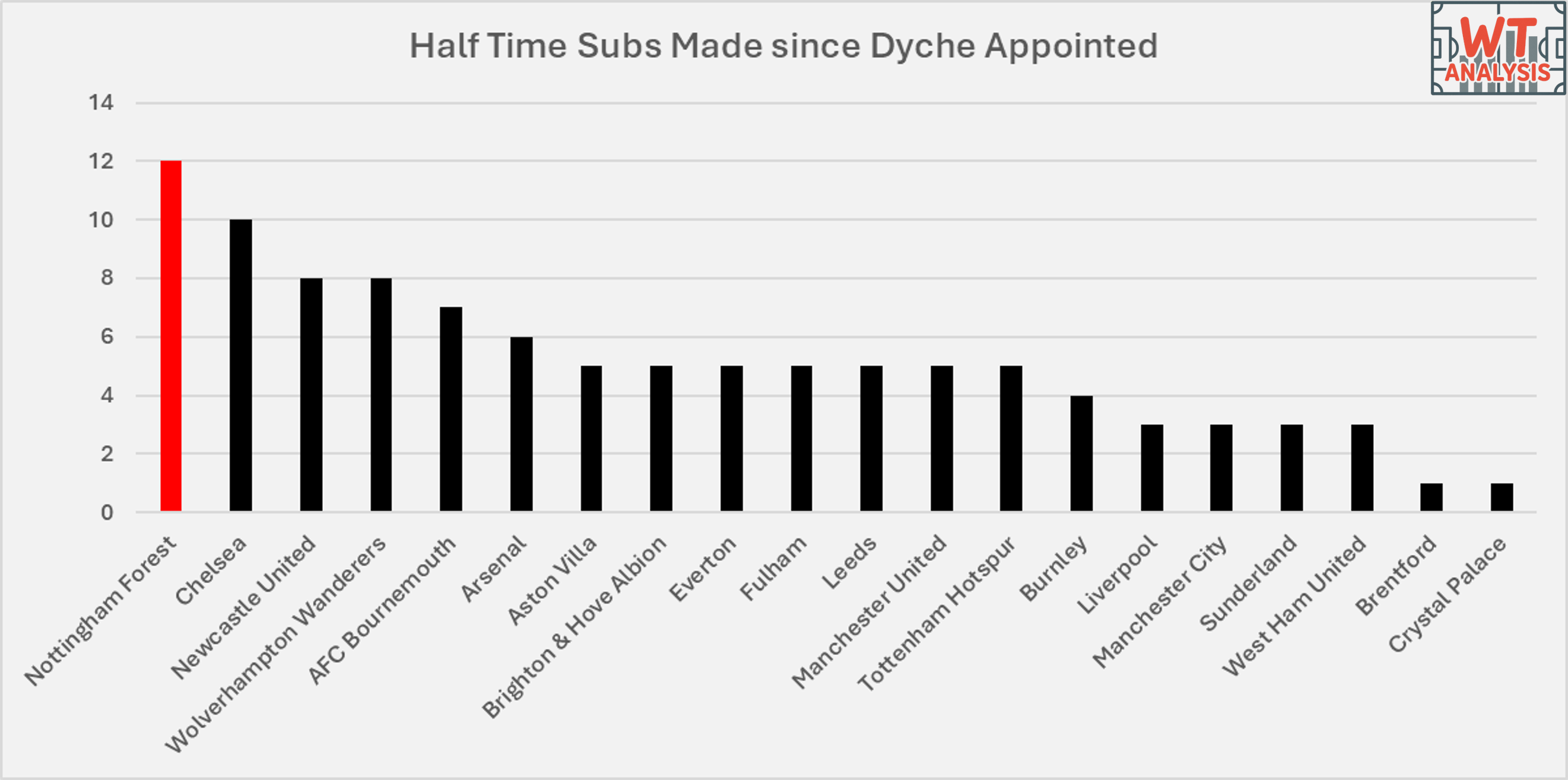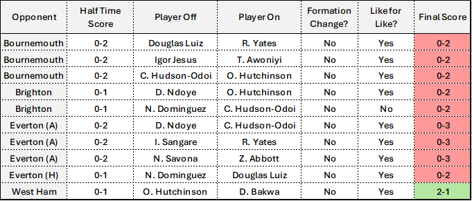 If we look at the 12 changes, only 2 of them were injury enforced (at least were reported as such). These were both in the recent Crystal Palace game, where Sels & Hudson-Odoi came of injured. The other 10 (which would still put Forest in a tie for 1st place with Chelsea), all came in games where Forest had already fallen behind off the back of very poor first-half performances.