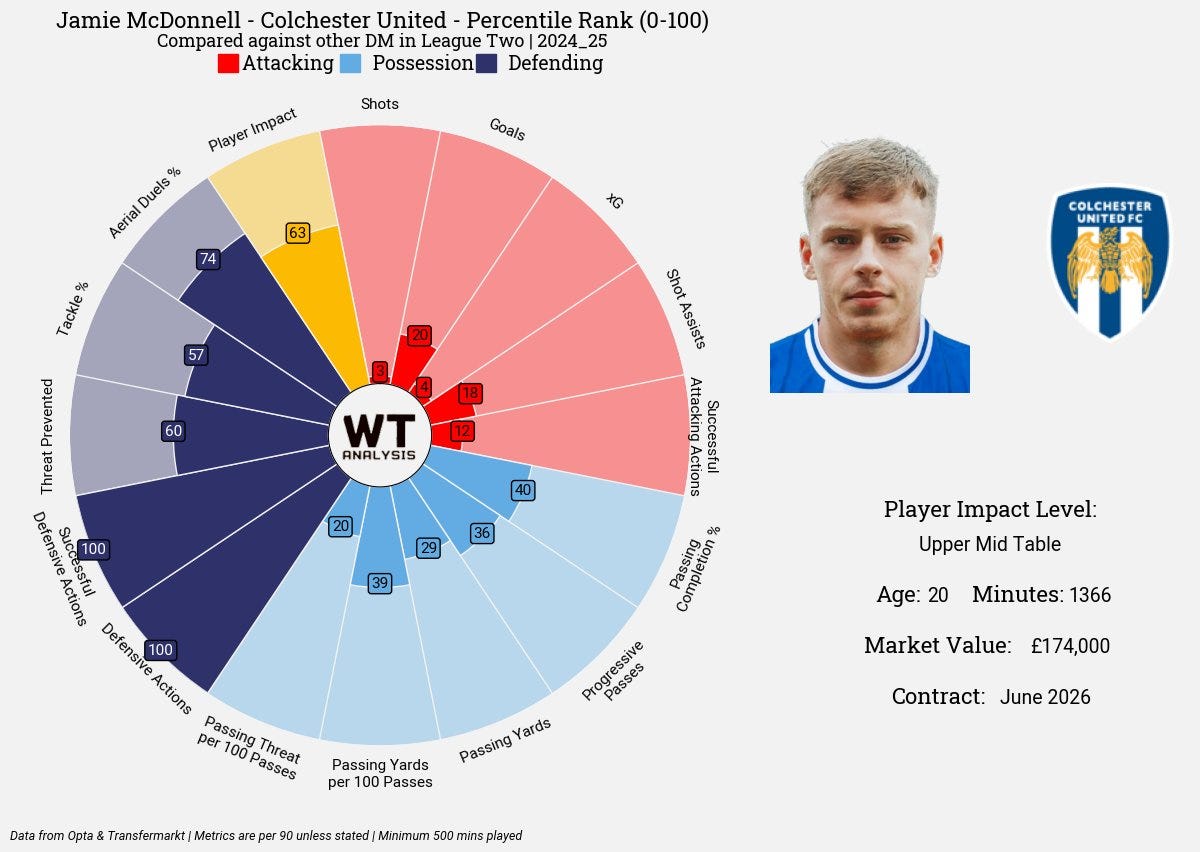 At 21, Jamie McDonnell has shown some really good progress since making his first senior loan move to Colchester United in League Two last season. His defensive numbers there at this time last year were tremendous, ranking 1st among all defensive midfielders for both the amount and the success he had in defensive actions.