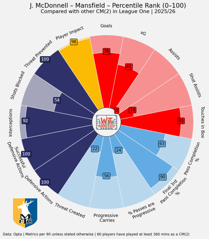 It’s a very similar story now he’s moved up a division to League One with Mansfield. He once again ranks as the best midfielder when monitoring the amount and the success of defensive actions - but this season he’s doing his defensive work in more high-value defensive areas (i.e. closer to his own box).