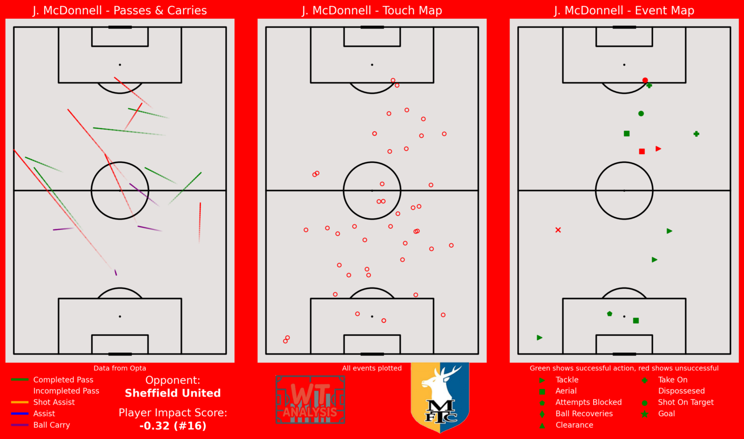 Looking at his action map, it would seem like he didn’t have a very busy afternoon. But so much of McDonnell’s work came off the ball in a match where his side only had 21% possession. In fact, due to the difficulty that the Blades had in getting through the partnership of McDonnell & Louis Reed, combined with some half-time tactical tweaks by Nigel Clough, the home side focussed a lot more down the wings in the second-half. This toned down McDonnell’s on-ball actions even further.