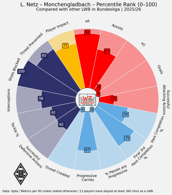 Netz’s data profile suggests he is able to get into some very good positions to make some very valuable defensive contributions - with a Threat Prevented percentile ranking of 83. No LWB in the Bundesliga has blocked more shots per 90 than Netz either.
