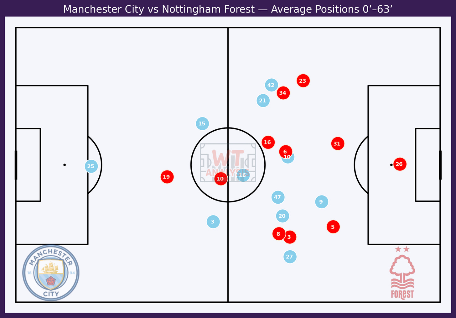 If Forest were playing against a side with ‘traditional’ wingers and full backs, then Domínguez would have been asked to do a lot more work out wide (as we’ve seen previously when he’s been used on the wing), but because Man City’s width was provided by their full backs, he was able to concentrate on defending the width of the penalty box in Forest’s half.
